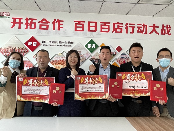 3月份開始開拓合作 百日百店行動大戰(zhàn)啟動,露總為三位發(fā)展總監(jiān)頒發(fā)聘任書,簽訂軍令狀并進(jìn)行啟動說明會,圓滿完成百日百店任務(wù)。